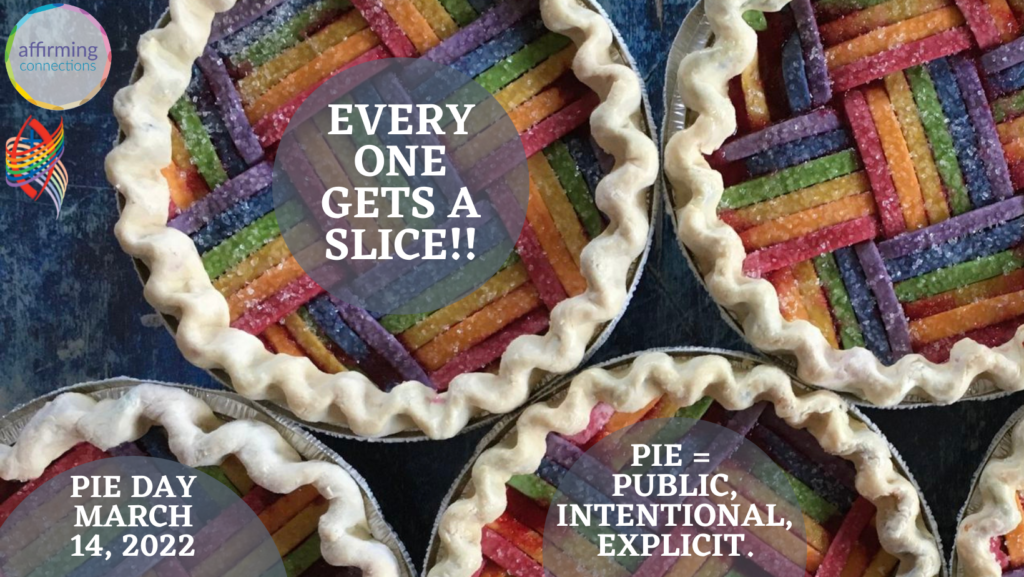 Why PIE? PIE = Public. Intentional. Explicit. Those are the standards we hold ourselves to when we seek to live into being Affirming people and communities by, for, and with Two Spirit and LGBTQIA+ people.